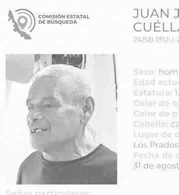 La ficha 24/SB 1312U-24ZS reporta la desaparición de Juan José Cuellar Hernández, de 67 años de edad, con quien se perdió el contacto el pasado 31 de agosto de 2024 en Los Prados,