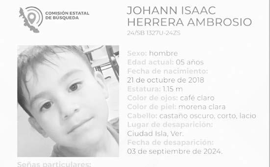 La ficha 24/SB 1327U-24ZS reporta la desaparición de Johann Isaac Herrera Ambrosio, de cinco años de edad, con quien se perdió el contacto el pasado 3 de septiembre de 2024 en Ciudad Isla, Veracruz.