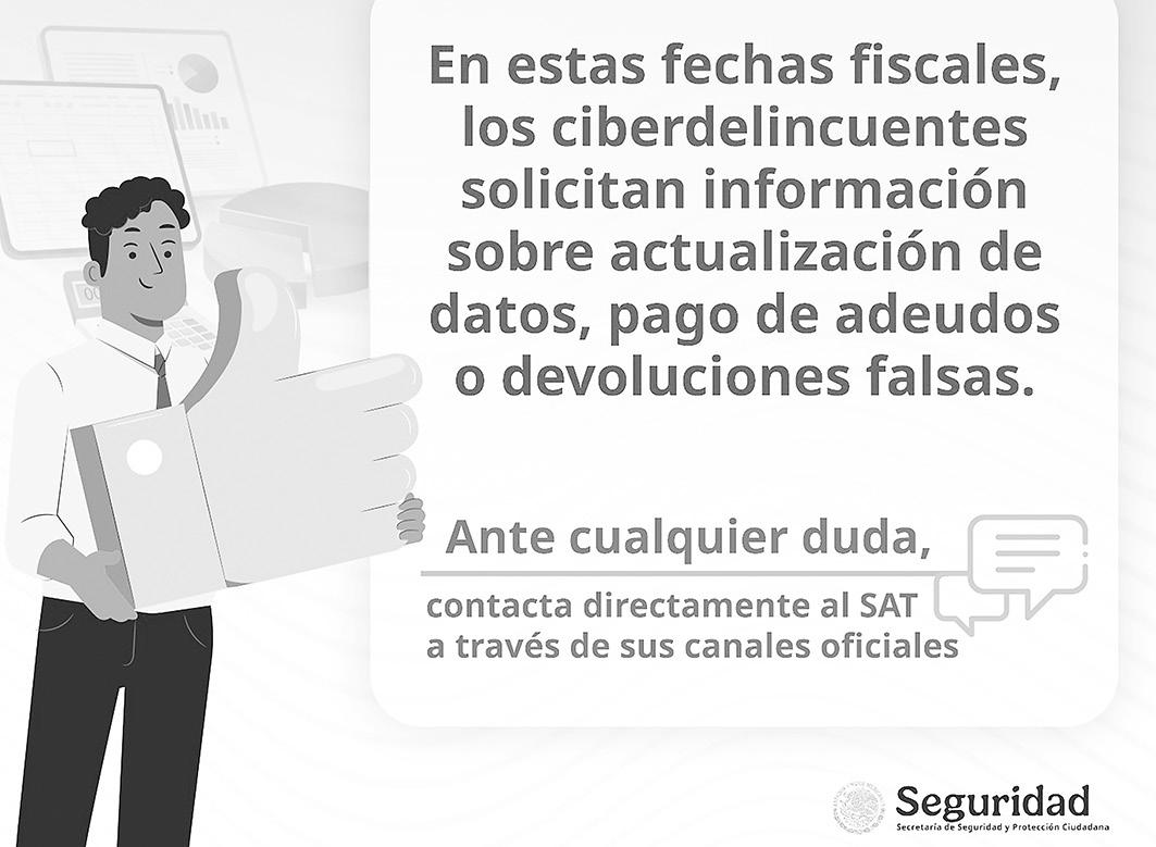 Resultado del monitoreo constante de la red de internet, la Secretaría de Seguridad y Protección Ciudadana (SSPC), a través de la Dirección General de Gestión de Servicios, Ciberseguridad y Desarrollo Tecnológico, emite una alerta a contribuyentes y público en general sobre posibles estafas y fraudes a través de páginas y correos electrónicos falsos del Sistema de Administración Tributaria (SAT). Los ciberdelincuentes aprovechan la temporalidad del cierre fiscal y presentación de declaraciones de personas físicas y morales para realizar estafas a contribuyentes, mediante cuentas de correo electrónico y mensajes de texto falsos, con un leguaje formal y logotipos similares a los utilizados por el SAT.
