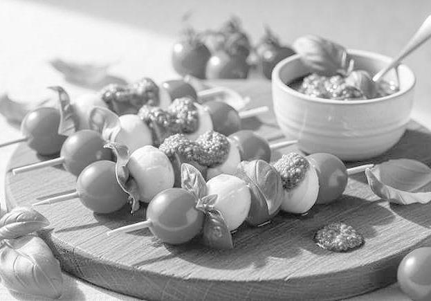 Brochetas Caprese con Pesto