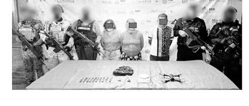 En el lugar, se logró la detención en flagrancia de Severa “N”, Leticia “N” y Arnulfo “N”, así como el aseguramiento de hierba verde seca con características similares a las de la marihuana, una sustancia granulada transparente con características similares a las del cristal, una báscula gramera y un dron.