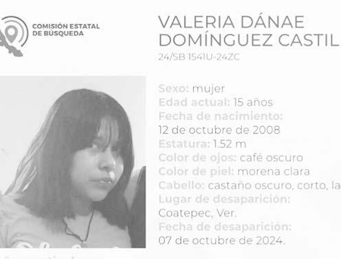 Hernández, de 41 años de edad, con quien se perdió el contacto el pasado 5 de octubre de 2023 en Xalapa, Veracruz. La ficha 24/SB 1541U-24ZC reporta la desaparición de Valeria Danae Domínguez Castillo, de 15 años de edad, con quien se perdió el contacto el pasado 7 de octubre de 2024 en Coatepec, Veracruz.