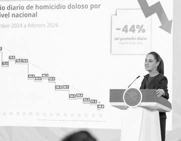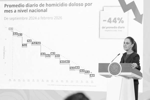 Ciudad de México.- La Presidenta de México, Claudia Sheinbaum Pardo, destacó que, gracias a la Estrategia Nacional de Seguridad, los homicidios dolosos en el país disminuyeron 44 por ciento, de septiembre de 2024 a febrero de 2026, al pasar de un promedio diario de 86.9 a 48.8, lo que representa una reducción de la violencia de 38 homicidios diarios menos; siendo febrero de este año el más bajo desde 2015.