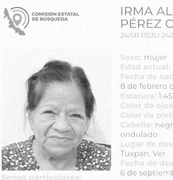La ficha 24/SB 1353U-24ZN reporta la desaparición de Irma Alicia Pérez Cano, de 75 años de edad, con quien se perdió el contacto el pasado 6 de septiembre de 2024 en Tuxpan, Veracruz.