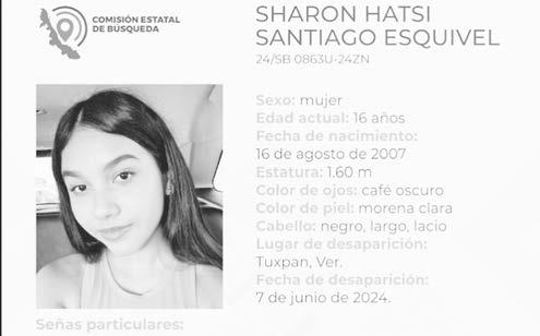 La ficha 24/SB 0863U-24ZN reporta la desaparición de Sharon Hatsi Santiago Esquivel, de 16 años de edad, con quien se perdió el contacto el pasado 7 de junio de 2024 en Tuxpan, Veracruz.