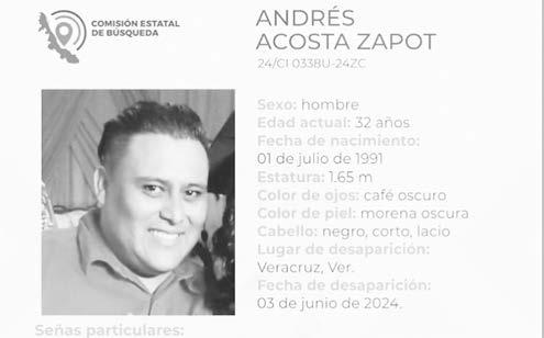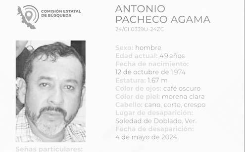 La ficha 24/CI 0338U-24ZC reporta la desaparición de Andrés Acosta Zapot, de 32 años de edad, con quien se perdió el contacto el pasado 3 de junio de 2024 en Veracruz, Veracruz. La ficha 24/CI 0339U-24ZC reporta la desaparición de Antonio Pacheco Agama, de 49 años de edad, con quien se perdió el contacto el pasado 4 de mayo de 2024 en Soledad de Doblado, Veracruz.