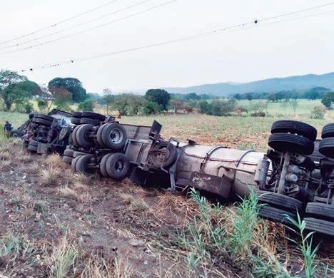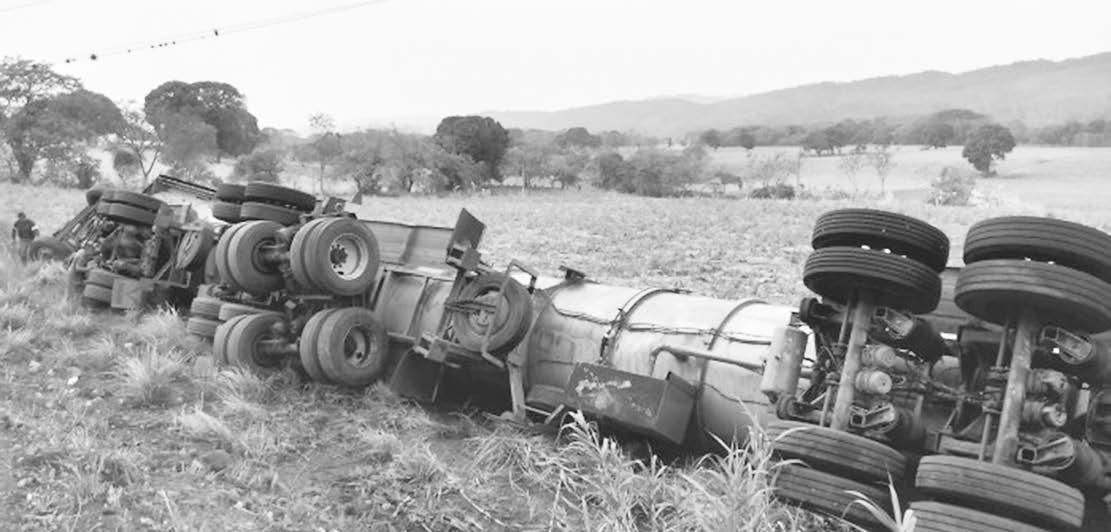 El aparatoso percance se suscitó esta mañana de jueves en el kilómetro 5 del tramo carretero Manuel León o San José de Gracia- Venta Parada, cuando el conductor del tráiler Kenworth de color blanco y con placas: 92AS1S del Transporte Público Federal, que remolcaba una pipa cargada con melaza procedente del ingenio San Miguelito, perdió el control a causa del peso y la aparente velocidad inmoderada en que viajaba, se salió de la carpeta de rodamiento y ter-