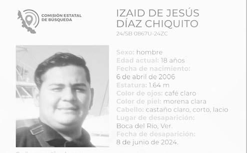 La ficha 24/SB 0867U-24ZC reporta la desaparición de Izaid de Jesús Díaz Chiquito, de 18 años de edad, con quien se perdió el contacto el pasado 8 de junio de 2024 en Boca del Río, Veracruz.