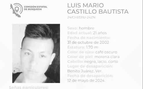 La ficha 24/CI 0331U-24ZN reporta la desaparición de Luis Mario Castillo Bautista, de 21 años de edad, con quien se perdió el contacto el pasado 12 de mayo de 2024 en Benito Juárez, Veracruz.