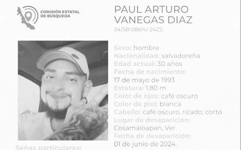 La ficha 24/SB 0861U-24ZC reporta la desaparición de Paul Arturo Vanegas Díaz, de 30 años de edad, con quien se perdió el contacto el pasado 1 de junio de 2024 en Cosamaloapan, Veracruz.