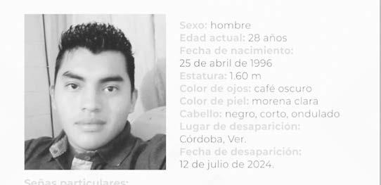 Guadalupe Díaz Hoyos de 37 años y con domicilio en Río Blanco, desapareció el viernes 12 de julio, la cual cuenta con una cicatriz en la ceja y de complexión delgada como señas particulares, además tiene una estatura de 1.50 metros, ojos color negro, de tez morena oscura y con cabello teñido de rojo, largo y lacio. El hombre Marcos Alejandro Morales Rojas de 28 años y con domicilio en Córdoba, desapareció el viernes 12 de julio y tiene una cicatriz en la ceja derecha y tatuajes en el hombro derecho como señas particulares, además tiene una estatura de 1.60 metros, ojos café oscuros, de tez morena clara y con cabello negro, corto y ondulado.