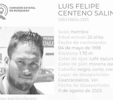 La ficha 23/CI 0561U-23ZS reporta la desaparición de Luis Felipe Centeno Salinas, de 25 años de edad, con quien se perdió el contacto el pasado 11 de agosto de 2023 en Coatzacoalcos, Veracruz.