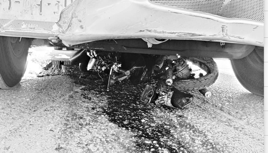 La motocicleta quedó en la parte de debajo de la pesada unidad, mientras que su conductor huyó del lugar abandonando el tráiler que remolcaba una cisterna. El tracto camión marca International de la empresa Arguelles Lozano con domicilio en Cosoleacaque, portaba el número económico 1231 y placas 45-A-5D del servicio de transporte público de carga, quedó resguardado por autoridades policiacas en espera de la llegada de personal de Tránsito.