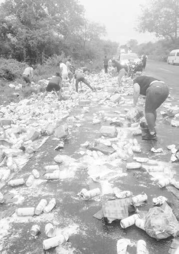 A los 10 minutos del accidente se generó el amontonamiento de personas que empezaron a recoger las cajas con 24 unidades de cerveza Modelo, así también en cubetas se llevaban las latas sueltas.