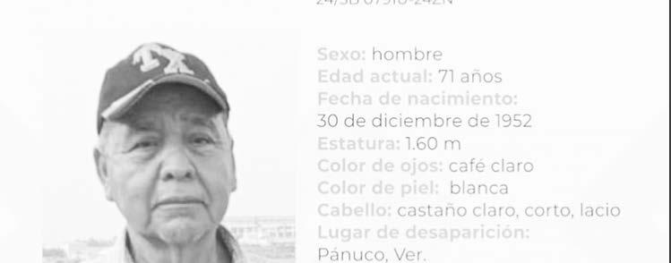 La ficha 247SB 0791U-24ZN reporta la desaparición de Venancio Cruz Hernández, de 71 años de edad, con quien se perdió contacto el pasado 25 de mayo de 2024 en Pánuco, Veracruz.