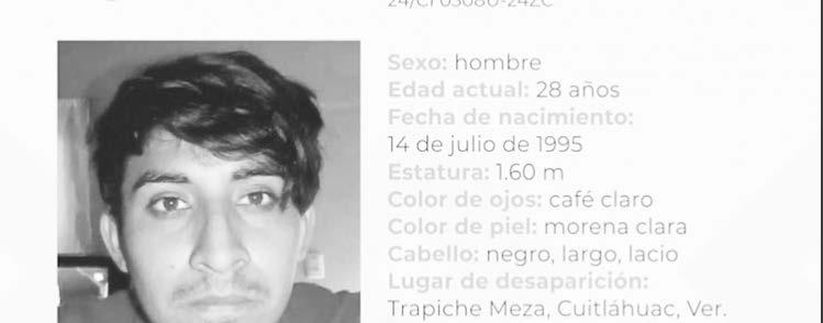 La ficha 24/CI 0308U-24ZC reporta la desaparición de Gamaliel Pérez Ramírez, de 28 años de edad, con quien se perdió contacto el pasado 13 de mayo de 2024 en Trapiche Meza, Cuitláhuac, Veracruz.