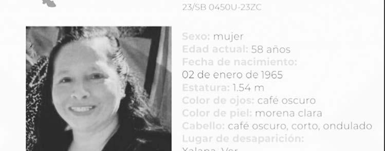 La ficha 23/SB 0450U-23ZC reporta la desaparición de María de Lourdes Barrientos Jiménez, de 58 años de edad, con quien se perdió el contacto el pasado 15 de marzo de 2023 en Xalapa, Veracruz.