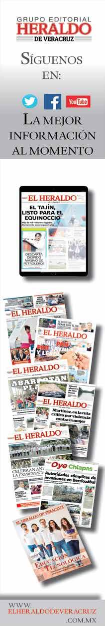 El Heraldo de Xalapa es una publicación de lunes a sábado. Editor responsable Ing. Eduardo Sánchez Macías. Número de Certificado de Reserva de Derecho al Uso Exclusivo del título 04-2010052510203900-101. Certificado de Licitud de Título: 15357 Certificado de licitud de contenido 15357. Domicilio de la publicación, impreso y distribuido por El Heraldo de Xalapa, con domicilio en Ávila Camacho No. 10, Col. Centro, C.P. 91000, Xalapa, Ver. TEL. 01 (228) 8419552, 8419319, 841 9363 y 841 9437.