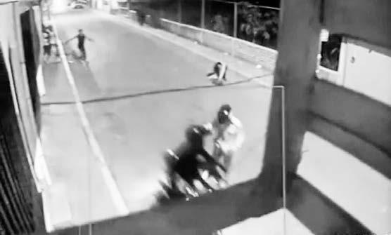 tirarla a la banqueta, pero también la arrastra a la calle para intentar arrebatarle la mochila, mientras el otro ladrón acomoda la motocicleta para escapar.