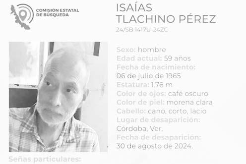 La ficha 24/SB 1417U-24ZC reporta la desaparición de Isaías Tlachino Pérez, de 59 años de edad, con quien se perdió el contacto el pasado 30 de agosto de 2024 en Córdoba, Veracruz.