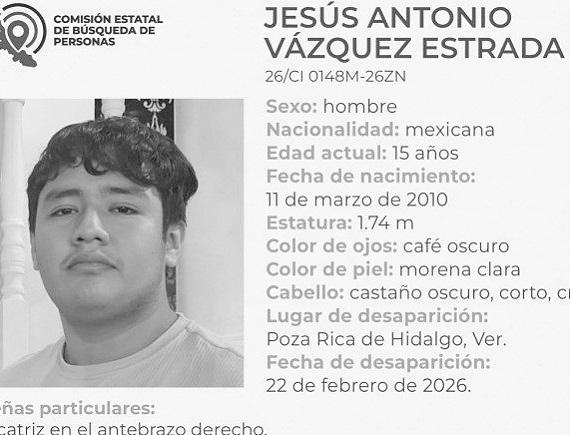 Jesús Antonio Vázquez Estrada, 15 años, originario de Tihuatlán, reportado como no localizado el domingo.