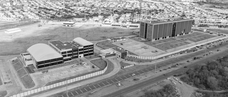 Se trató de una obra desarrollada desde una visión integral en 29 hectáreas con 320 mil metros cuadrados de construcción, generando más de 3 mil 700 empleos directos y 7 mil indirectos. Detalló que el edificio principal tiene capacidad de mil 100 personas y cuenta con 600 viviendas para trabajadores y sus familias, así como espacios de recreación. Agregó que a esta obra se suma la construcción, por parte de la Defensa Nacional, de siete secciones aduaneras en Baja California, 12 en Sonora, nueve en Chihuahua, cuatro en Coahuila y 16 en Tamaulipas, que concluyeron en 2024 y que están equipadas con aparatos de última tecnología como detectores de mercancía para evitar contrabando, laboratorios móviles de