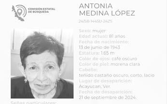 La ficha 24/SB 1445U-24ZS reporta la desaparición de Antonia Medina López, de 81 años de edad, con quien se perdió el contacto el pasado 21 de septiembre de 2024 en Acayucan, Veracruz.