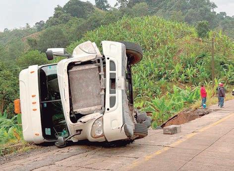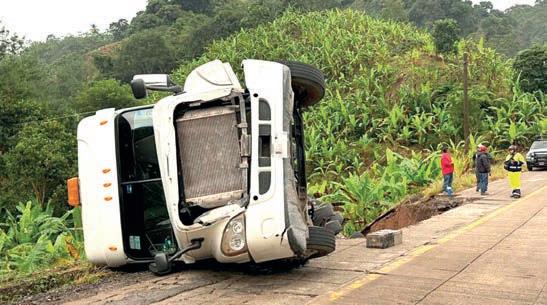 peta asfáltica cedió, originando un socavón que causó la aparatosa volcadura de la pesada unidad.