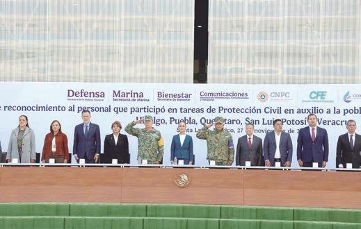 Desde el Centro Estratégico Militar de Acopio, la Presidenta de México, Claudia Sheinbaum, rindió homenaje y reconoció al personal que participó en la aplicación del Plan DN-III-E y Plan Marina en Hidalgo, Puebla, Querétaro, San Luis Potosí y Veracruz, tras las intensas lluvias que se presentaron el pasado octubre, y a quienes agradeció por sus esfuerzos para atender la emergencia en un mes y con ello demostrar que la patria es más fuerte que cualquier adversidad.