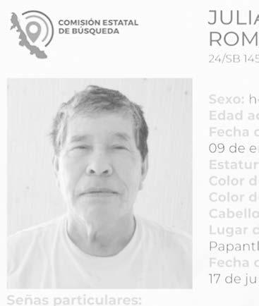 La ficha 24/SB 1451U-24ZN reporta la desaparición de Julián Román Patiño, de 67 años de edad, con quien se perdió el contacto el pasado 17 de julio de 2024 en Papantla, Veracruz.