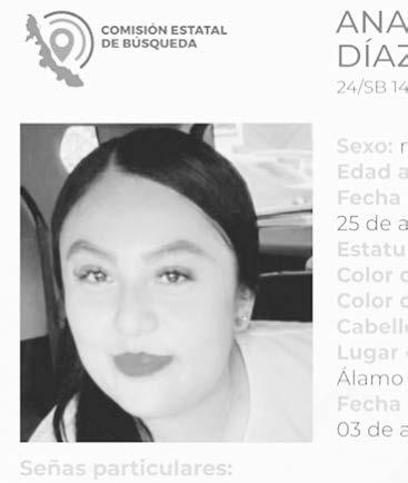 La ficha 24/SB 1424U-24ZN reporta la desaparición de Ana Dalay Díaz Castillo, de 23 años de edad, con quien se perdió el contacto el pasado 3 de agosto de 2024 en Álamo-Temapache, Veracruz.