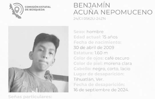 La ficha 24/CI 0562U-24ZN reporta la desaparición de Benjamín Acuña Nepomuceno, de 15 años de edad, con quien se perdió el contacto el pasado 16 de septiembre de 2024 en Tihuatlán, Veracruz.