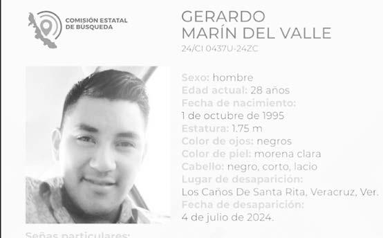 La ficha 24/CI 0437U-24ZC reporta la desaparición de Gerardo Marín del Valle, de 28 años de edad, con quien se perdió el contacto el pasado 4 de julio de 2024 en Los Caños de Santa Rita Veracruz.