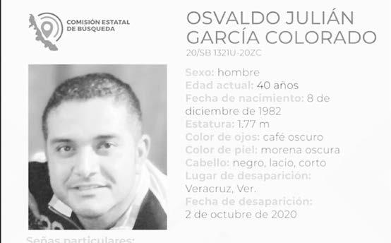 La ficha 20/SB 1321U-20ZC reporta la desaparición de Osvaldo Julián García Colorado, de 40 años de edad, con quien se perdió el contacto el pasado 2 de octubre de 2020 en Veracruz, Veracruz.