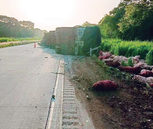 Un tráiler cargado con costales de cebollas se volcó a la circular sobre la autopista La Tinaja-Cosoleacaque la mañana de este domingo.