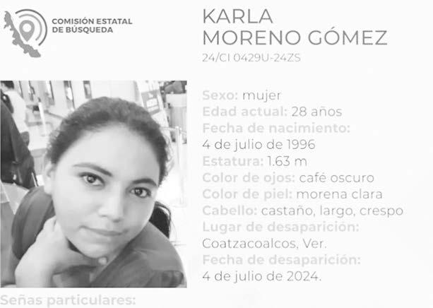 La ficha 24/SB 0429I-24ZS reporta la desaparición de Karla Moreno Gómez, de 28 años de edad, con quien se perdió contacto el pasado 4 de julio de 2024 en Coatzacoalcos, Veracruz.