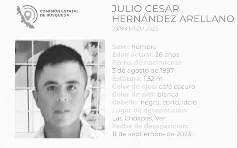 La ficha 23/SB 1452U-23ZS reporta la desaparición de Julio César Hernández Arellano, de 26 años de edad, con quien se perdió el contacto el pasado 11 de septiembre de 2023 en Las Choapas, Veracruz.