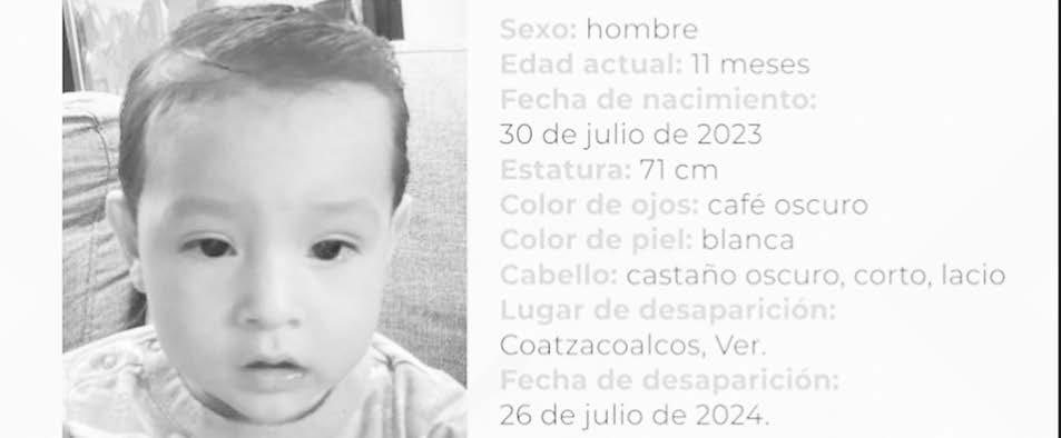 La ficha 24/SB 1156U-24ZS reporta la desaparición de Miguel Othón Aguayo Díaz, de 11 meses de edad, con quien se perdió contacto el pasado 26 de julio de 2024 en Coatzacoalcos.