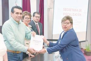 En el auditorio Sebastián Lerdo de Tejada del Palacio Legislativo, al lado del presidente de la Comisión Permanente de Vigilancia, diputado Miguel Guillermo Pintos Guillén, de la auditora general del Órgano de Fiscalización Superior del