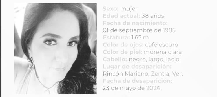 La ficha 24/SB 0786U-24ZC reporta la desaparición de Amparo Salinas Hernández, de 38 años de edad, con quien se perdió el contacto el pasado 23 de mayo de 2024 en Rincón Mariano, Zentla, Veracruz.