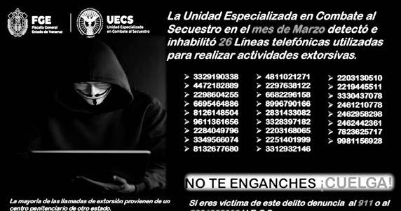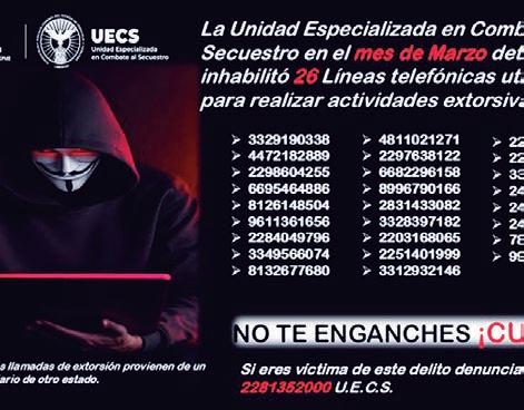La UECS exhorta a la población a colgar de inmediato en caso de recibir llamadas sospechosas y a reportarlas de forma anónima a través de los números: 089, 911 ó al 228 135 2000 (Unidad Antisecuestros de Veracruz)