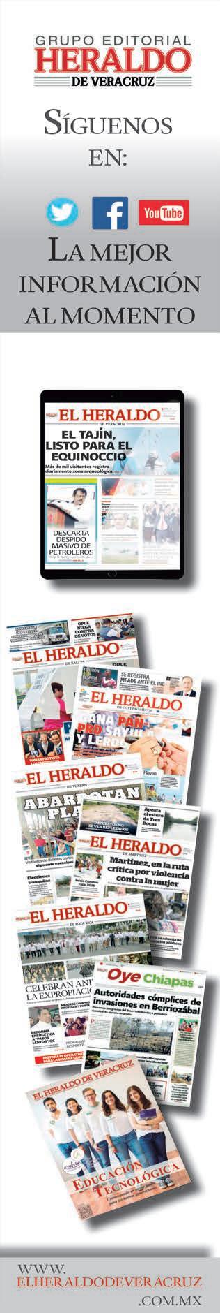 El Heraldo de Xalapa es una publicación de lunes a sábado. Editor responsable Ing. Eduardo Sánchez Macías. Número de Certicado de Reserva de Derecho al Uso Exclusivo del título 04-2010052510203900-101. Certi cado de Licitud de Título: 15357 Certi cado de licitud de contenido 15357. Domicilio de la publicación, impreso y distribuido por El Heraldo de Xalapa, con domicilio en Ávila Camacho No. 10, Col. Centro, C.P. 91000, Xalapa, Ver. TEL. 01 (228) 8419552, 8419319, 841 9363 y 841 9437. elheraldodeveracruz@gmail.com