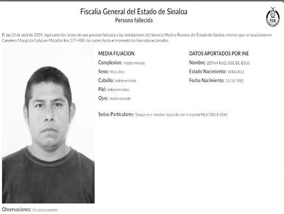 José de Jesús Zetina Ruiz, el 23 de abril sus restos ingresaron al Semefo, mismos que se localizaron en la carretera Maxipista Culiacán – Mazatlán kilómetro 177+400. Su cuerpo no ha sido reclamado por sus familiares.