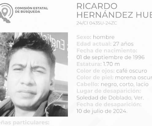 La ficha 24/SB 1168U-24ZC reporta la desaparición de Rafael Monterrubio Hernández, de 24 años de edad, con quien se perdió el contacto el pasado 17 de julio de 2024 en Veracruz, Veracruz.