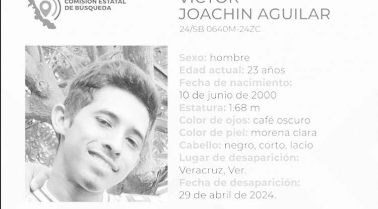 La ficha 24/SB 0640M-24ZC reporta la desaparición de Víctor Joaquín Aguilar, de 23 años de edad, con quien se perdió el contacto el pasado 29 de abril de 2024 en Veracruz, Veracruz.