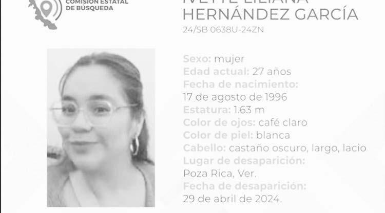 La ficha 24/SB 0638U-24ZN reporta la desaparición de Ivette Liliana Hernández García, de 27 años de edad, con quien se perdió el contacto el pasa-