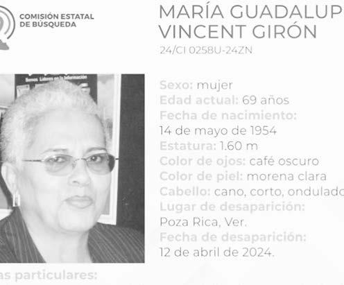 Zapata, de 55 años de edad, con quien se perdió el contacto el pasado 28 de abril de 2024 en Xalapa, Veracruz. La ficha 24/CI 0258U-24ZN reporta la desaparición de María Guadalupe Vincent Girón, de 69 años de edad, con quien se perdió el contacto el pasado 12 de abril de 2024 en Poza Rica, Veracruz.
