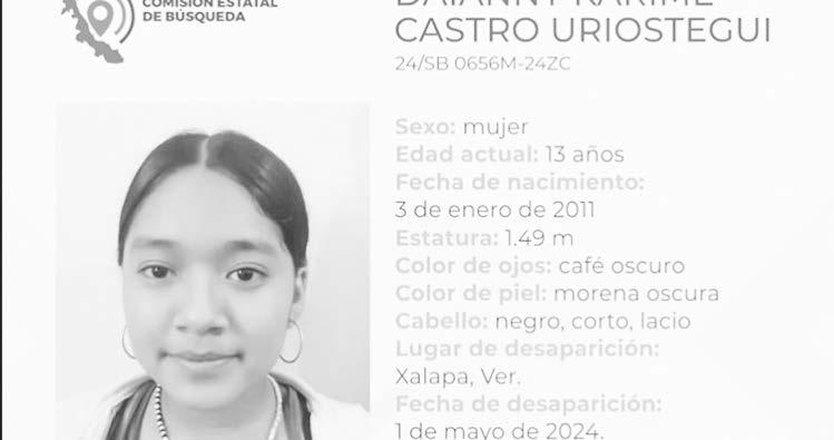 La ficha 24/SB 0656M-24ZC reporta la desaparición de Daianny Karime Castro Urióstegui, de trece años de edad, con quien se perdió contacto el pasado 1 de mayo de 2024 en Xalapa, Veracruz.