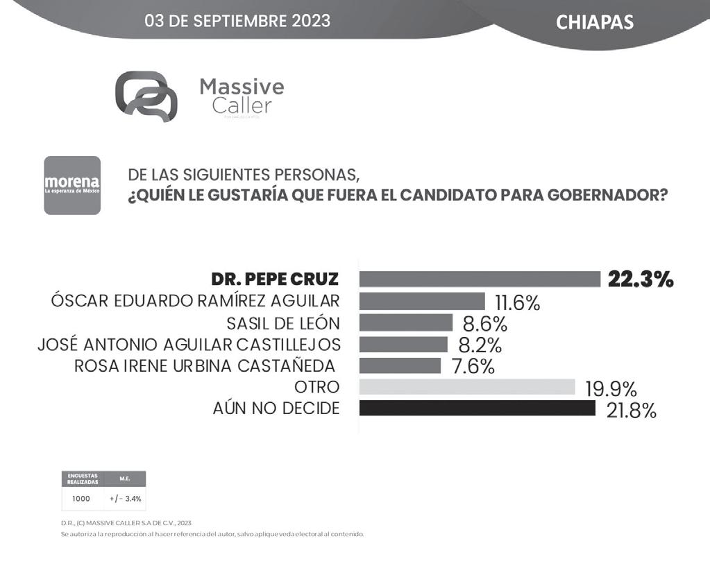 yich´belto paselyun te empresa Massive Caller, la yak´ ta ilel bayel ay skoltayel te partido MORENA ta jlumaltik Chiapas, k´ax ta lajuneb yox winik por ciento te skoltayel, sok ay bayel skoltayel te doktor Pepe Cruz, te banti ay a moj kol jun por ciento te skoltayel, la staj k´oel 49.6 por ciento.
