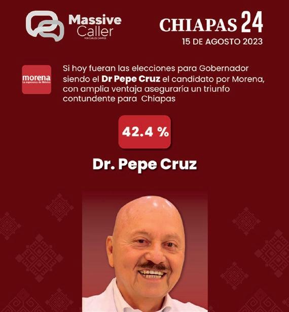 De acuerdo con la última encuesta elaborada por la empresa Massive Caller, el doctor Pepe Cruz asegura de manera contundente el triunfo de Morena en las próximas elecciones para la Gubernatura de Chiapas, con más del 40 por ciento de votos de las y los chiapanecos.